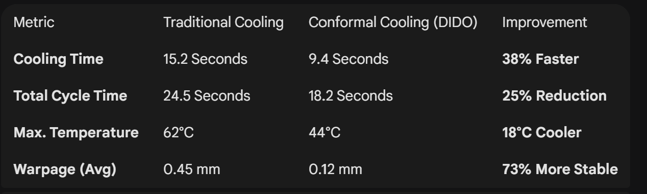 To overcome these hurdles, engineers implemented Conformal Cooling channels created through metal 3D printing (DMLS). These channels “conform” to the part’s geometry, maintaining a uniform distance from the cavity surface.