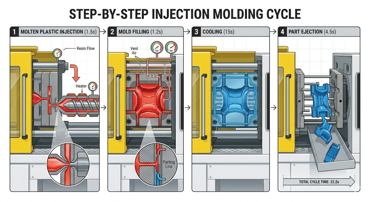 At its core, the process is straightforward. Plastic resin is heated until molten, injected under pressure into a mold cavity, cooled until solid, and ejected as a formed part. That cycle repeats thousands or even millions of times, depending on the product.